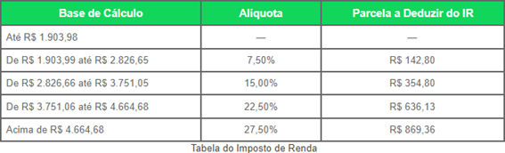 Confira abaixo, a tabela do Imposto de Renda Pessoa Física – IRPF: